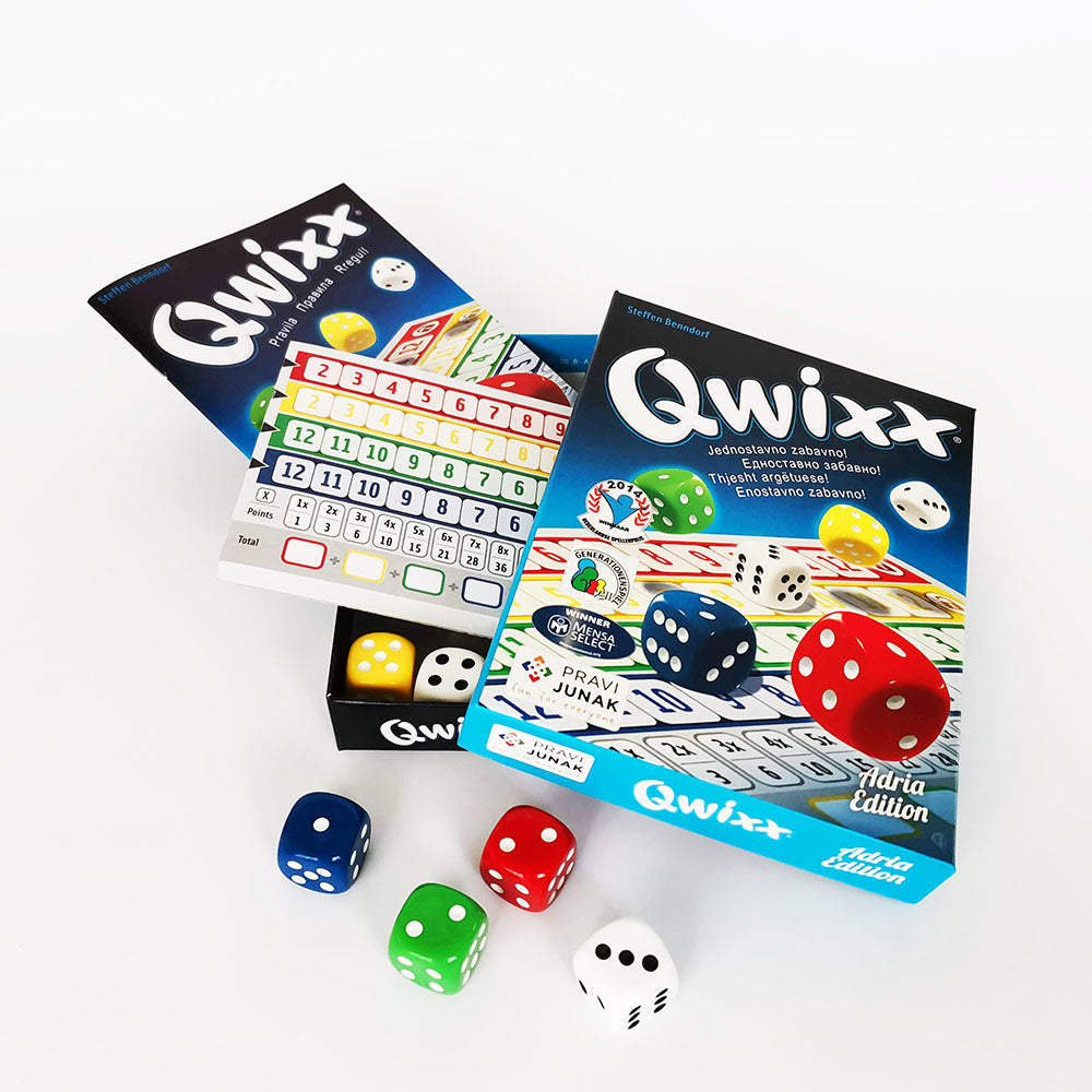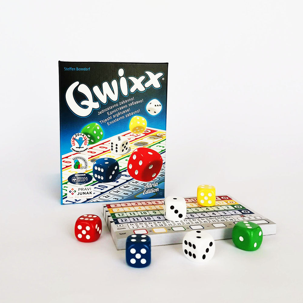 To je Adria Edition igre Qwixx, slovenska-hrvaška-srbska-makedonska-albanska izdaja igre.