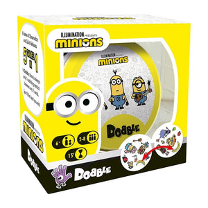 "The anarchic henchmen from the Despicable Me franchise join the Dobble fun! Between any two cards, there is always exactly one matching symbol. Will you be the first to spot it in the addictive game of speedy observation?"