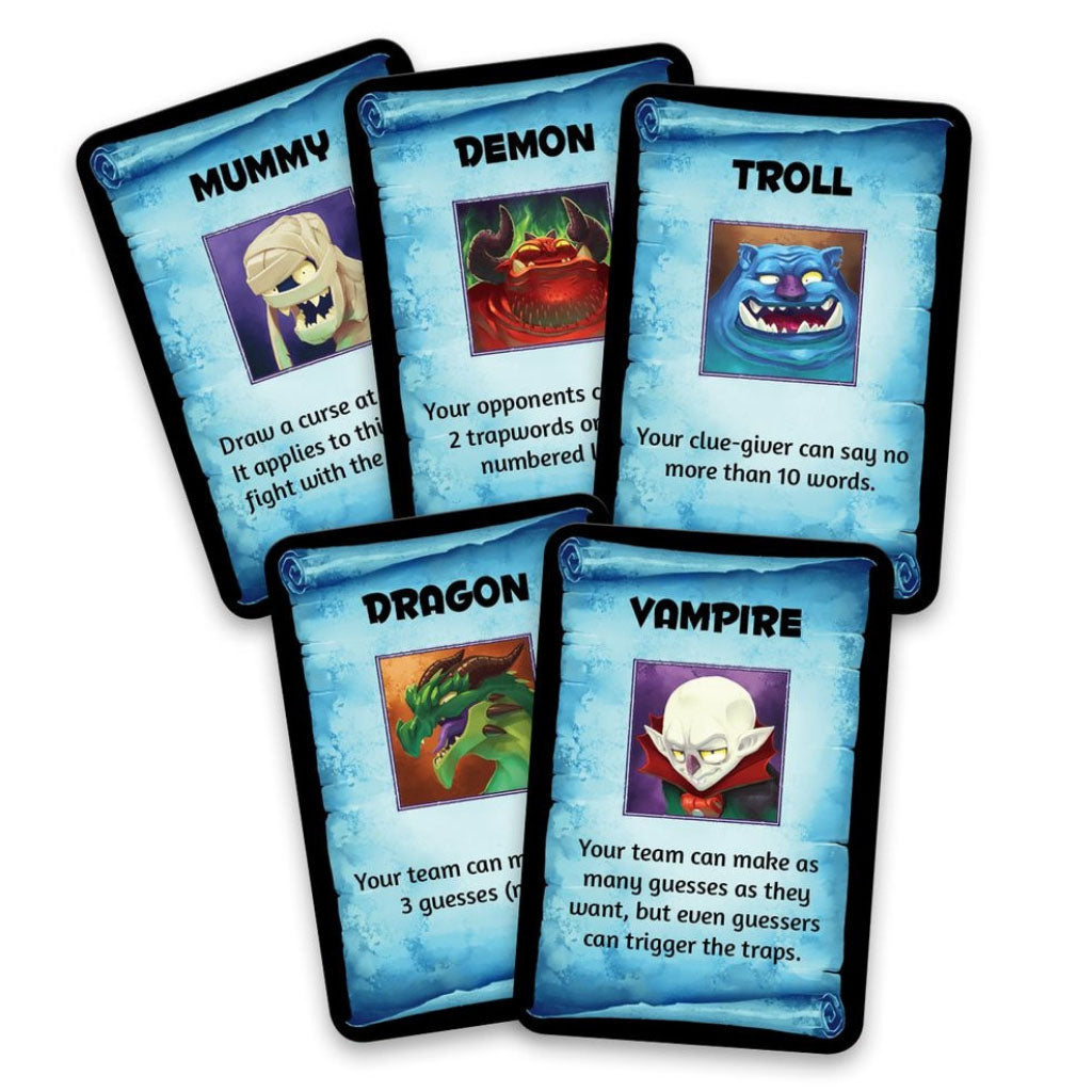 Družabna igra Trapwords se odvija v fantazijskem svetu, kjer vsaka ekipa nadzoruje svojo ekipo junakov, ki se mora na koncu spopasti z enim izmed grdobcev - z mumijo, trolom, orkom, vampirjem ali zmajem - ki vsak po svoje otežuje ugibanje pravilnih skrivnih gesel.