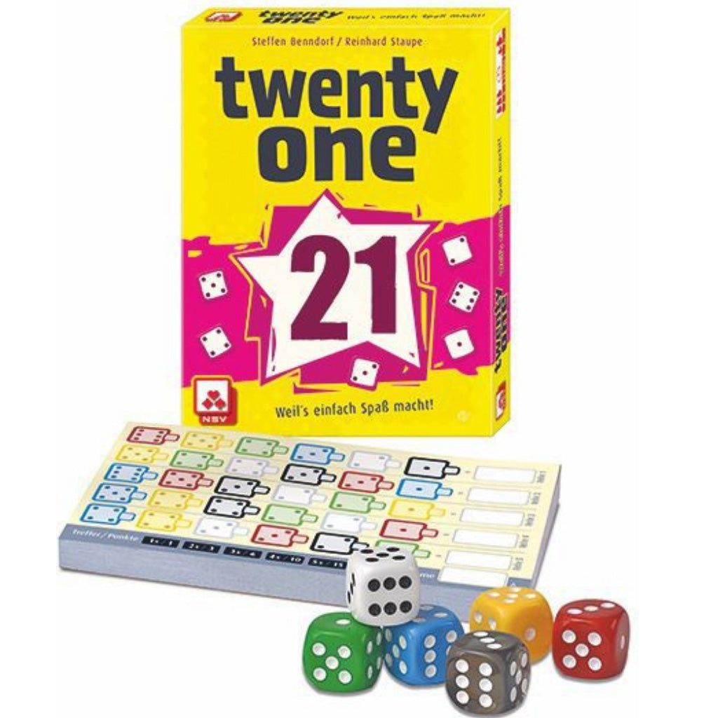 V Twenty One družabni igri s kockami mečemo 6 kock v modri, beli, zeleni, rdeči, črni in rumeni barve, s številkami od 1 do 6 ter beležimo števila na svoj liste papirja.
